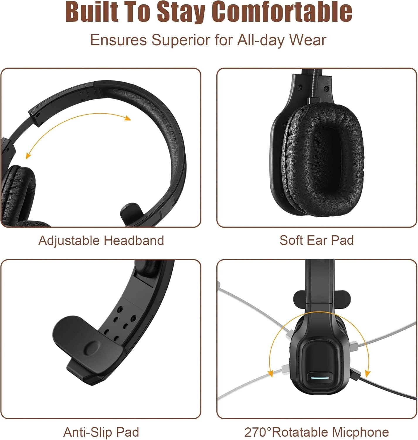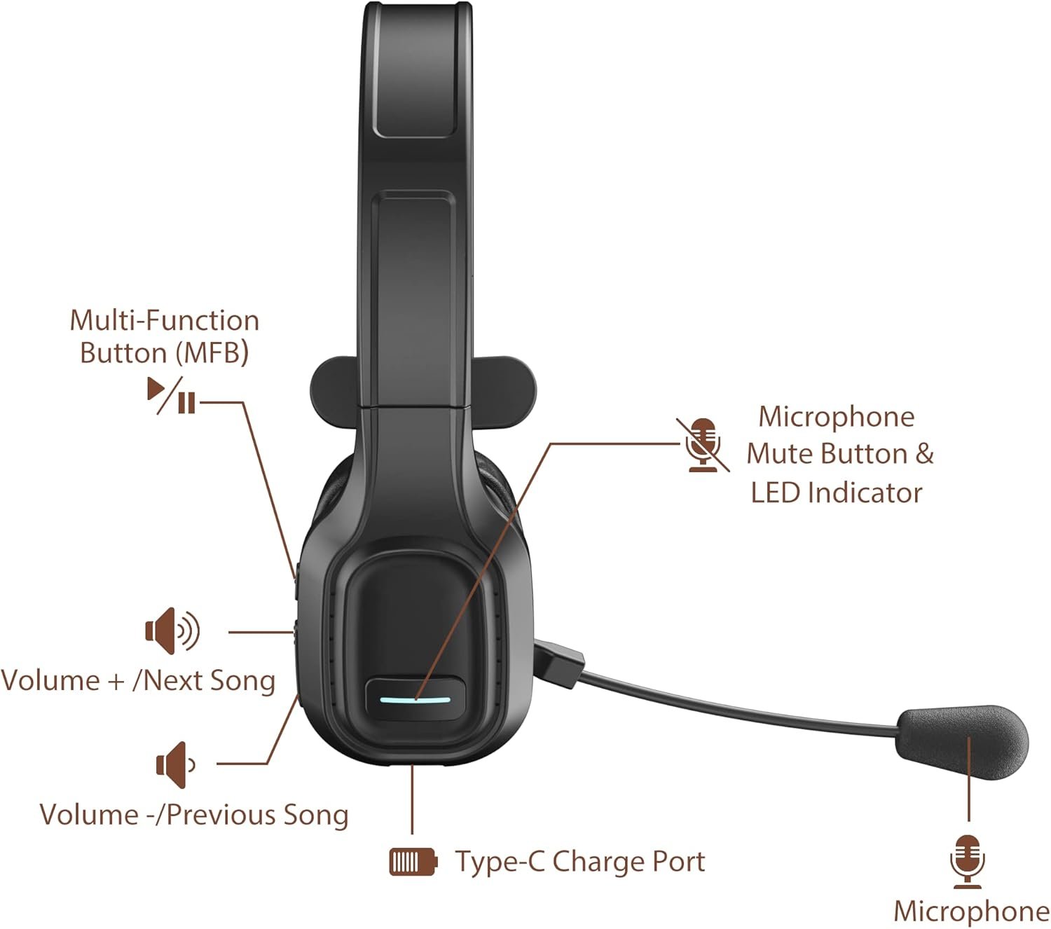 - 【Easy to Connect and Switching for Two Devices】Our Bluetooth headset adopts the Bluetooth 5.0 technology. Which makes bluetooth connection quickly, efficiently and stably. It can pair with 2 devices at the same time. You can quickly switch to your calling device with one click, so you won’t miss any important calls.
